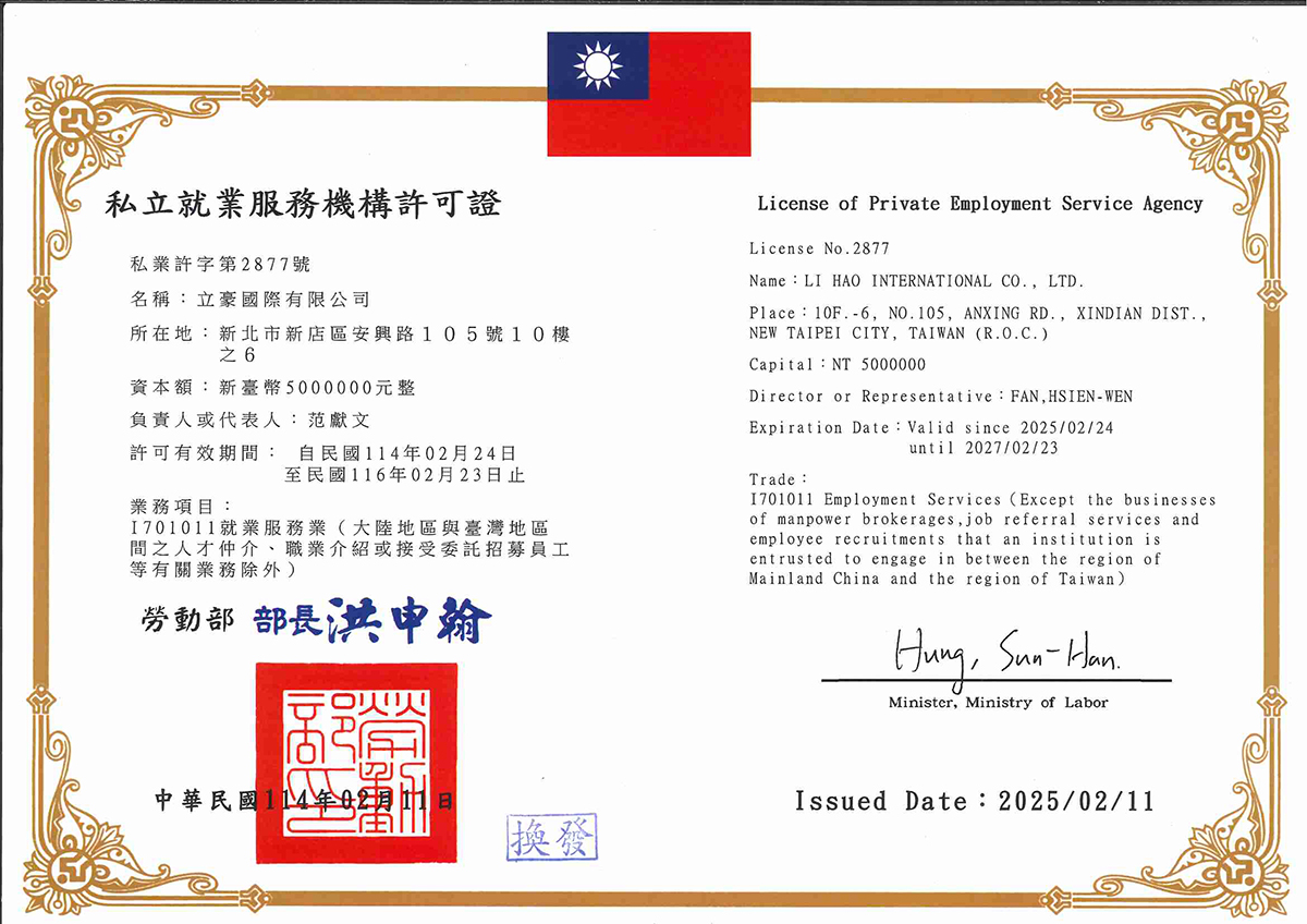 立豪國際有限公司優質團隊始終抱持「敬業樂群、腳踏實地、提高品質、服務客戶」為經營事業之準則,回饋社會,期待我們服務努力之熱忱,能提供給雇主們最大的助力。